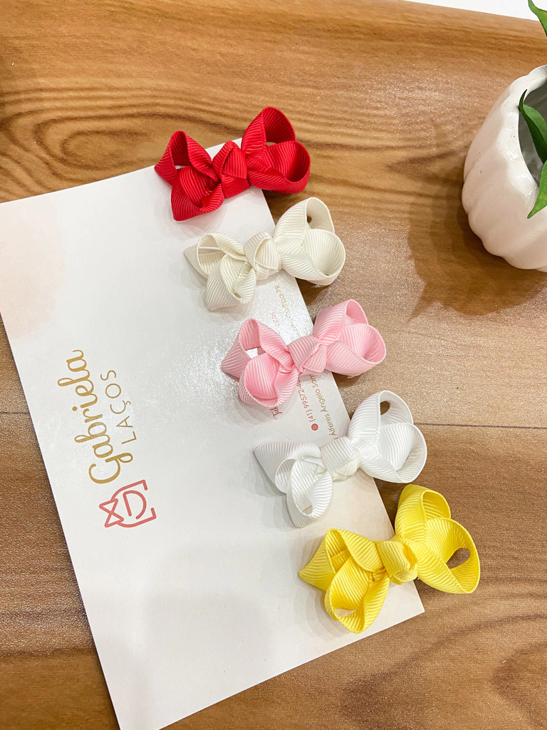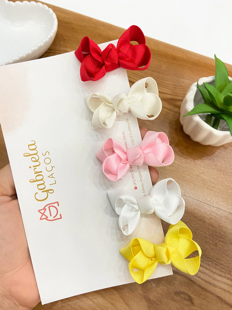 Encante sua pequena com o Kit Manuela Mini, composto por 5 mini laços cheios de charme, perfeitos para qualquer ocasião!
