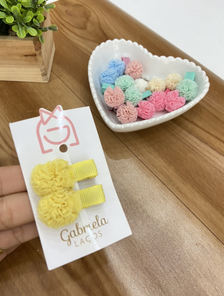 Encante com os Pompoms Tule Mini, perfeitos para deixar qualquer penteado ainda mais charmoso e delicado! Cada pompom tem aproximadamente 2,0cm e é finalizado em bico de pato forrado de 3,5cm, garantindo conforto e segurança nos cabelos.
